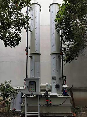 首先將待處理氣瓶連接到氣體控制面板上,使用氮氣置換pigtail部分,然后通過控制面板減壓并控制流量,將需要處理的氣體通入相應的洗滌塔,氣體通過洗滌塔的塔身內部,塔身內壁為酸/堿水霧,堿性/酸性氣體穿過水霧時和水霧中的酸/堿產生中和反應生成鹽。酸性氣體通入到堿洗滌塔,和洗滌塔中的堿進行酸堿反應生成鹽分,堿性氣體通入酸性洗滌塔。